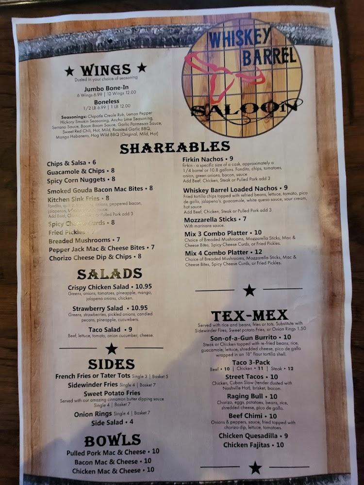 Whiskey Barrel boasts a diverse menu crafted for every palate. With over 30 dishes, choices abound! Starters like spicy corn nuggets to share make perfect companions for drinks. Fans love the jumbo bone-in wings, available in various flavors. The Tex-Mex section includes taco 3-packs and beef chimichangas. Don’t miss the hearty pulled pork mac & cheese, a crowd favorite. Sweet potato fries and onion rings round out the meal options. There are salads for lighter bites, ensuring something for everyone. Exceptional cocktails and craft beers enhance the dining experience, fusing taste with joy.